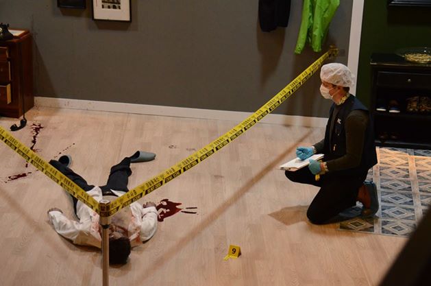 The whole thing was set up with incredible attention to detail. As soon as we walked in we were given a couple of cool CSI vests, along with all of the forensic gear to make sure we didn’t spoil the evidence of the crime scene…you know, the gloves, the shoe covers, hair protector, and surgical mask. I couldn’t believe the horrific scene, I felt bad for the poor dead guy who was lying there (who was actually a rubber dummy cast from my student’s Dad himself!) I noted bruising to his face, and chest – cuts to his chest, and violent slashes to his wrist…self defense wounds…I thought to myself, fully pretending that I was now in a television show.